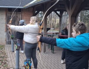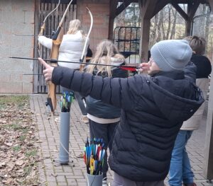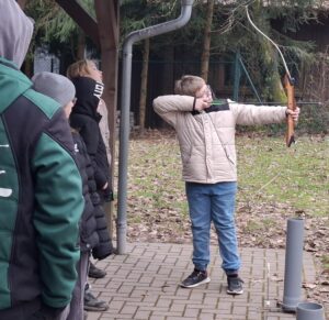 Am Nachmittag ging es zum Bogenschießen, vom Spannen des Bogens über das richtige Zielen bis zum Holen des Pfeiles.